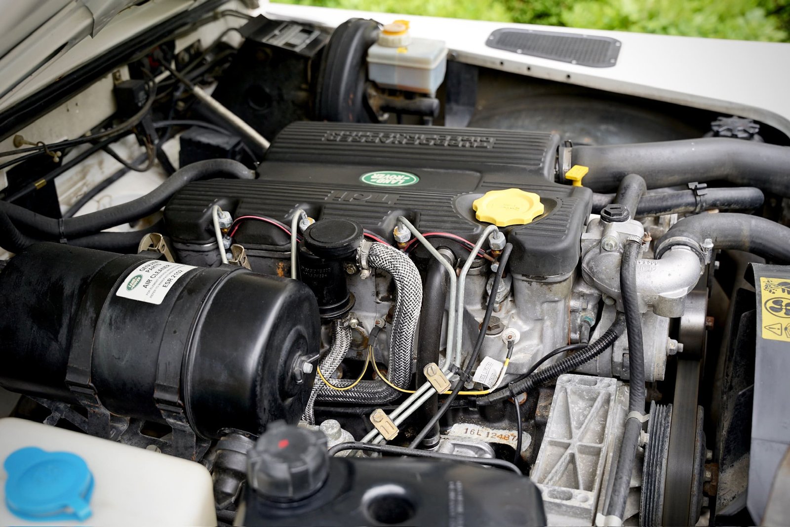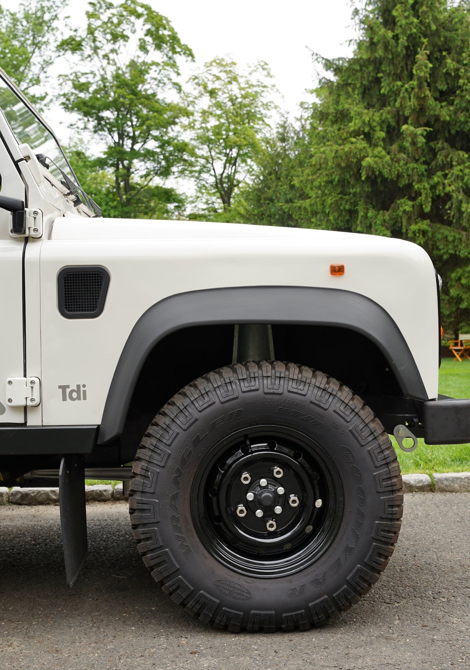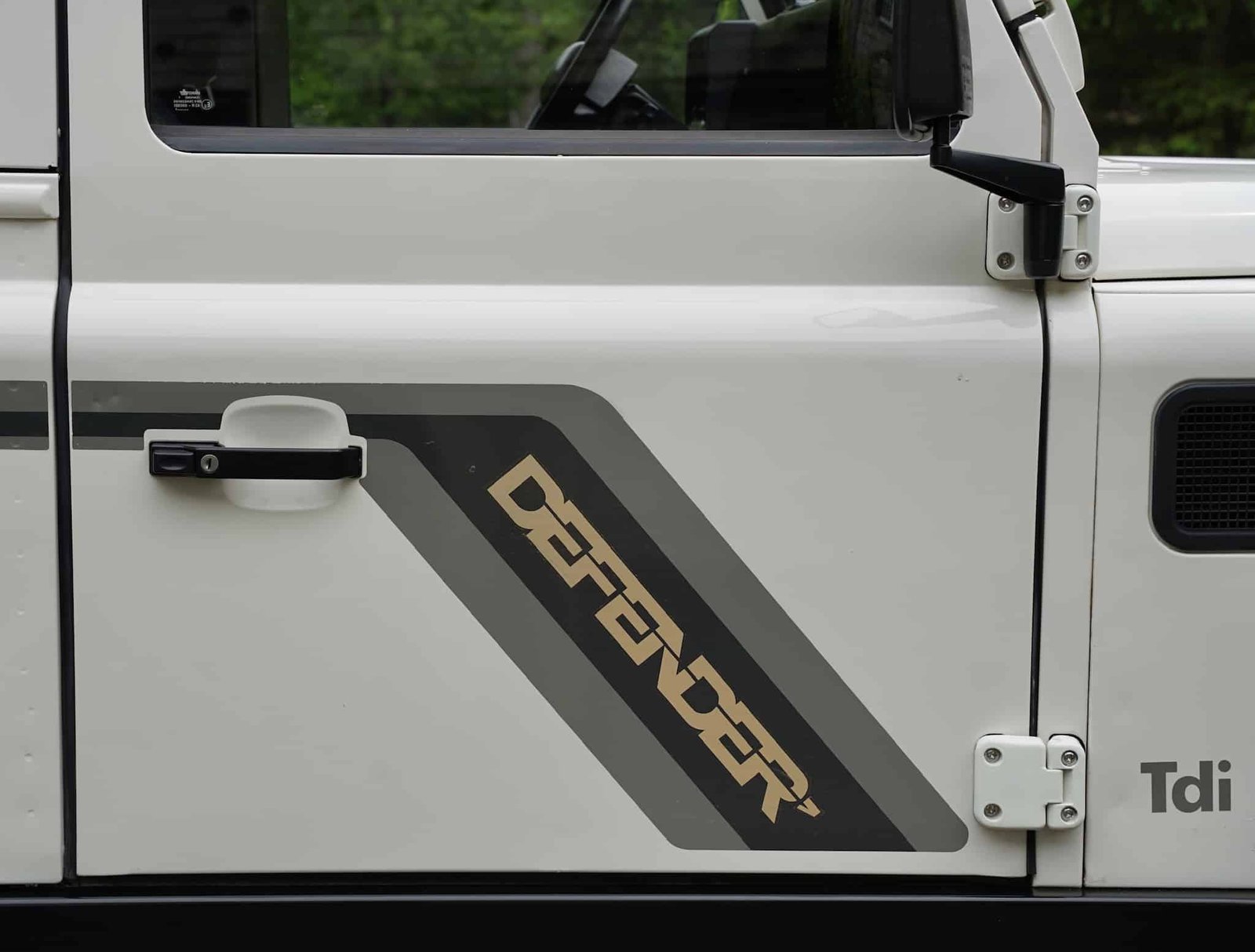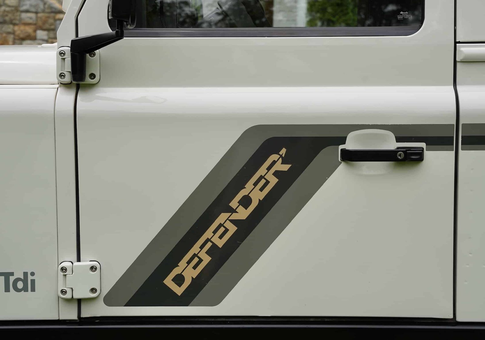 The body panels remain remarkably straight. It retains its original graphics, original headlight surrounds, Britax mirrors, and Wipac Quadoptic headlights. A later-style rear door was fitted to replace the weak original and painted to match. Original-style TD5 hinges were replaced and reinstalled, with upgraded front hinges matched to the body.
