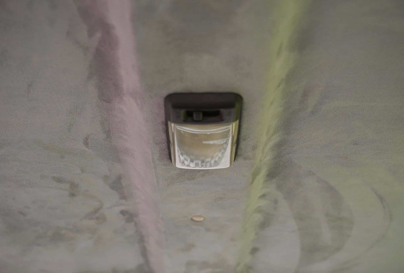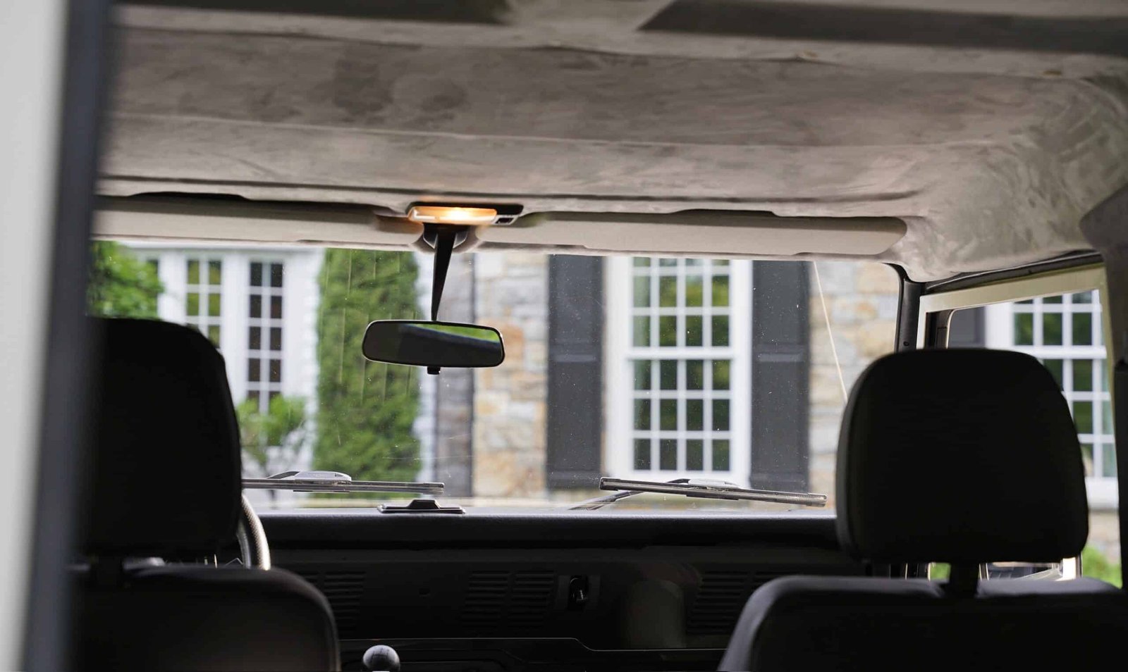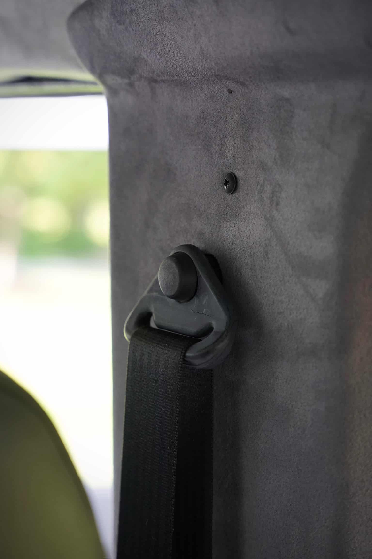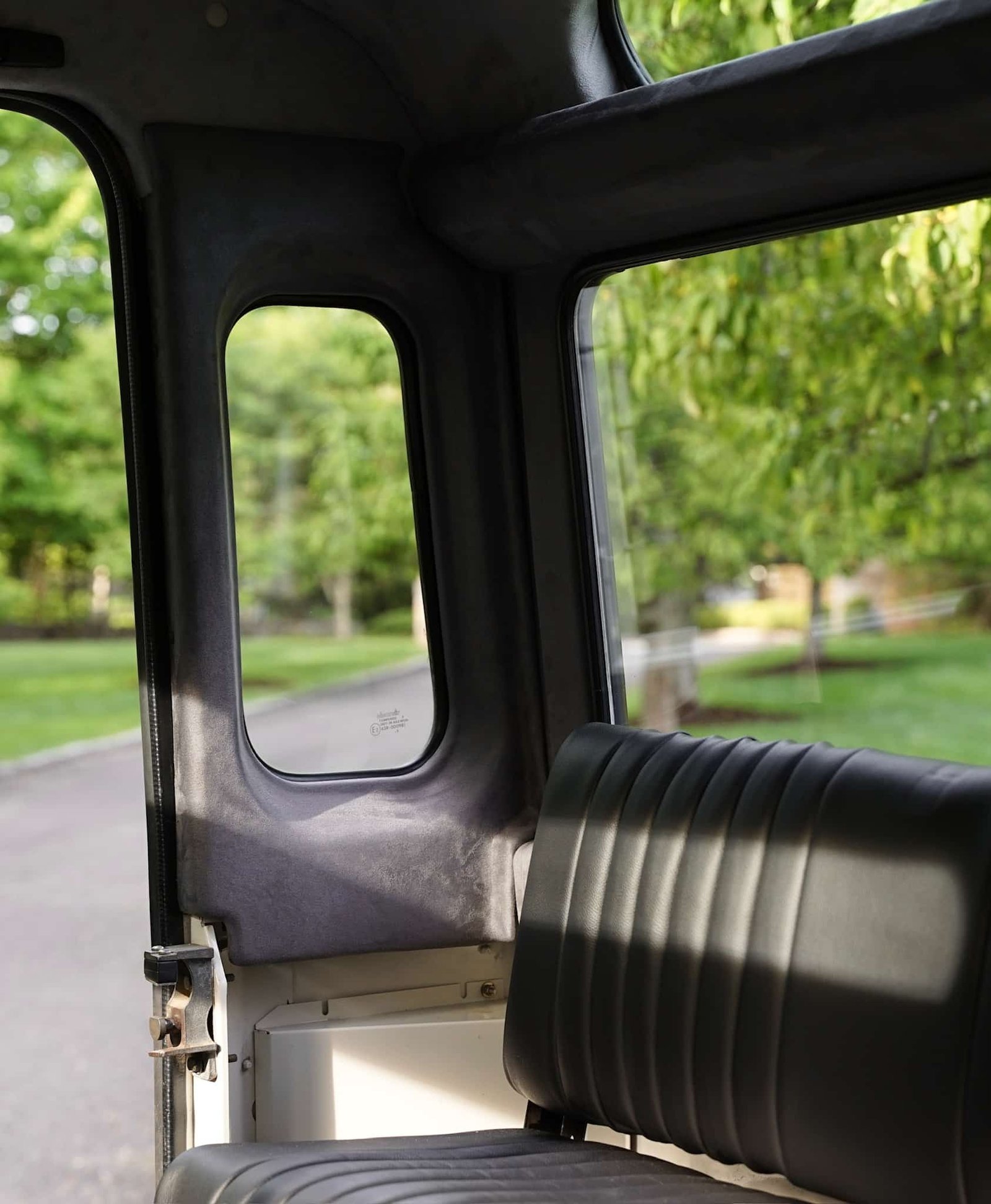 The original headliner and interior side panels/crash pads were reupholstered with alcantara/microsuede in light grey for the headliner and a darker tone for the sides, echoing the original palette while elevating the cabin finish. Additional sound deadening and closed-cell foam have been added beneath all surfaces, including the roof, for enhanced refinement.