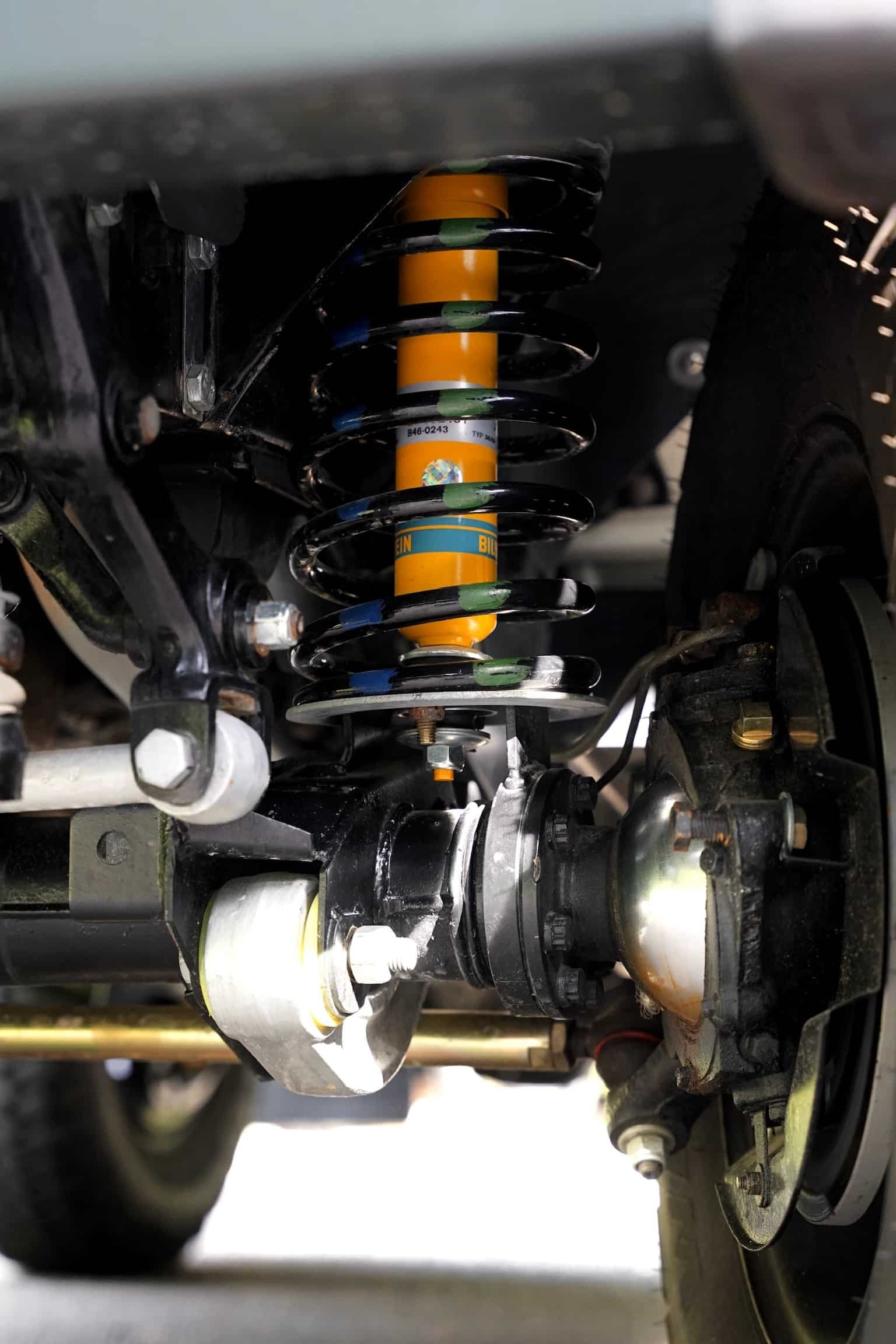 Front brakes were upgraded with new discs, pads, and braided brake lines. Rear brakes, recently replaced by the previous owner, remain in excellent condition. All wheel bearings were removed, inspected, cleaned, and re-greased with new oil seals installed. A heavy-duty steering damper from Bilstein and uprated HD steering rods with new track rod ends complete the underbody mechanical work.