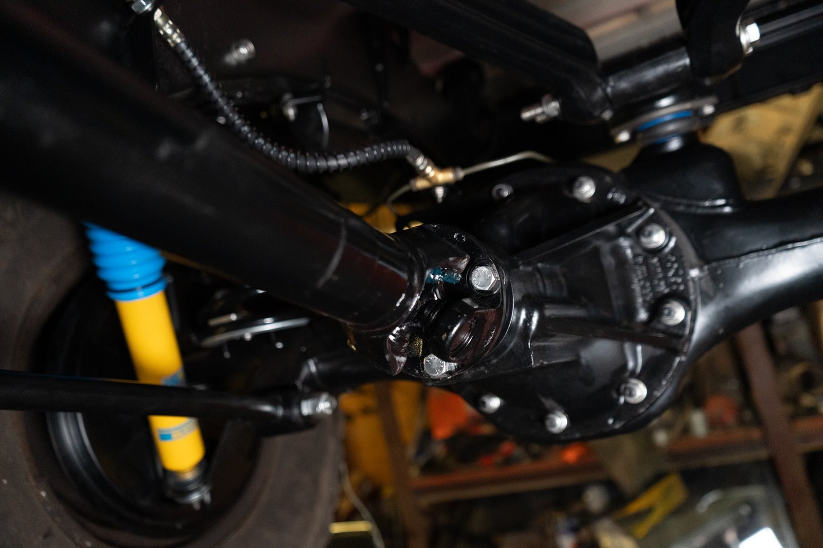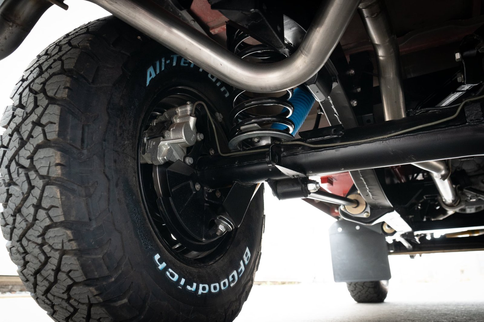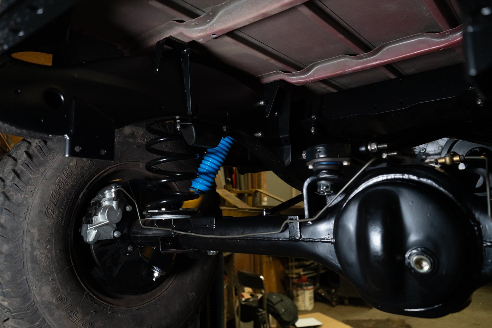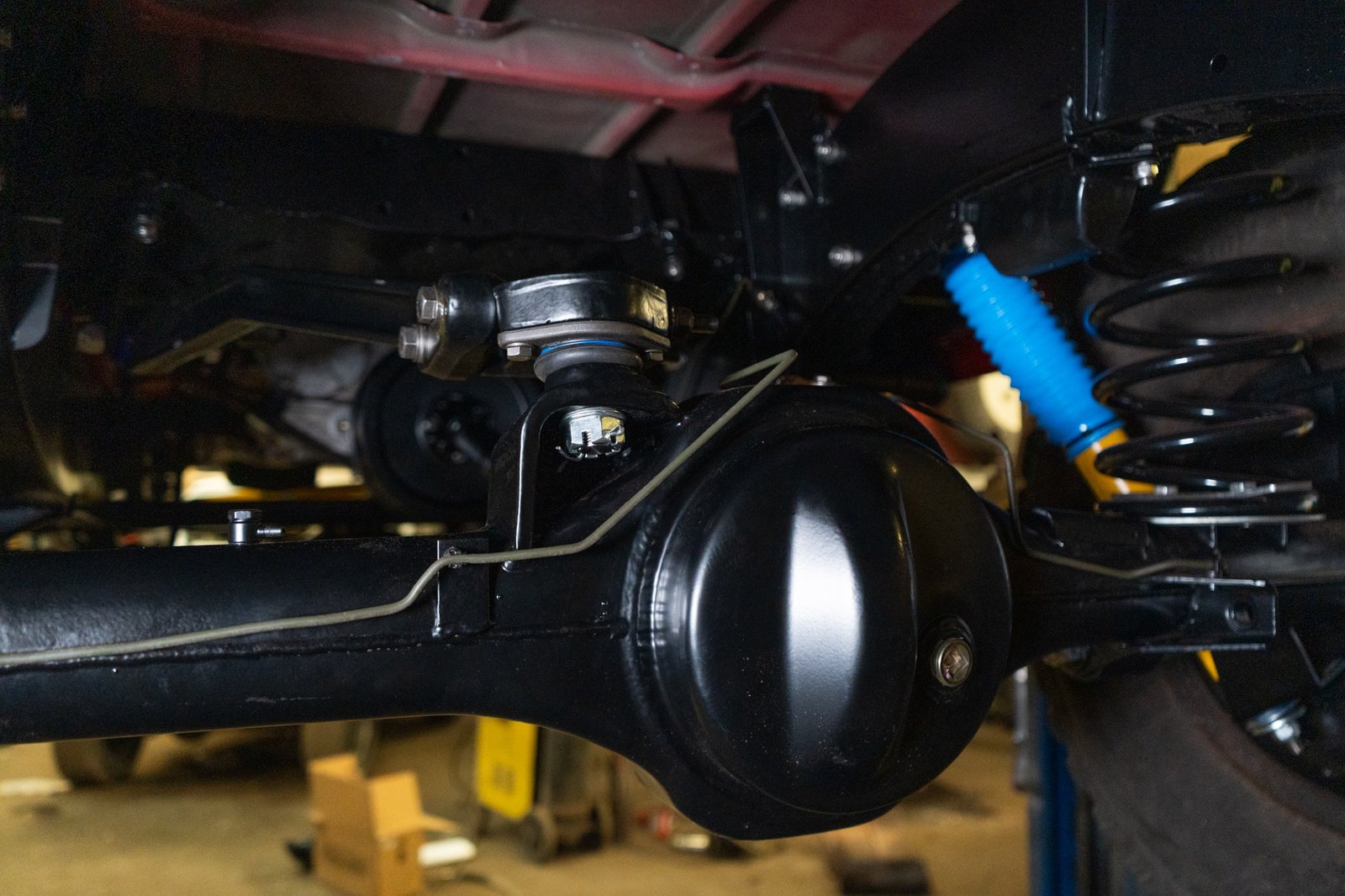 Both axles received the same treatment—sandblasted, powder-coated, and rebuilt. Suspension and steering upgrades include: