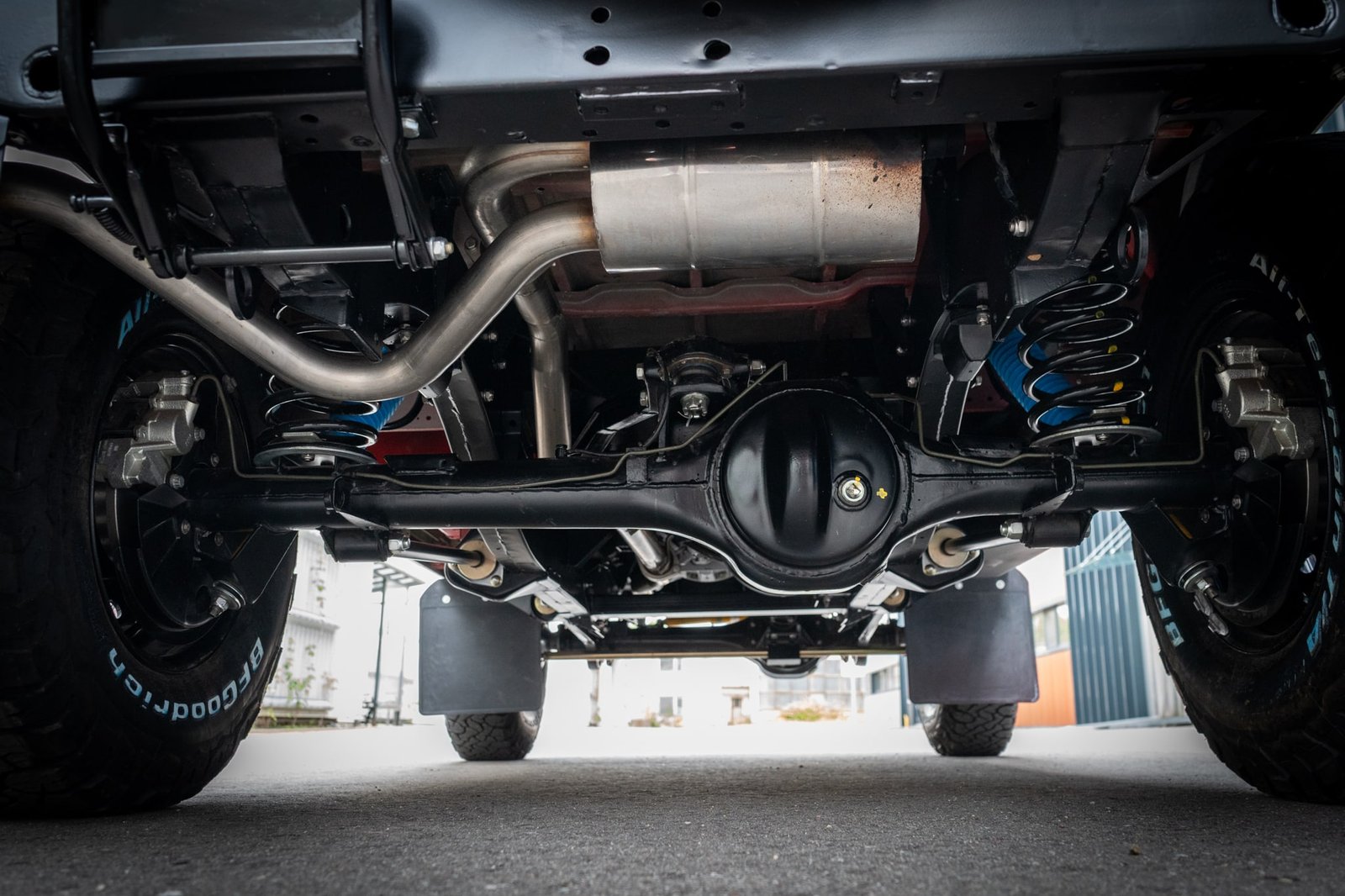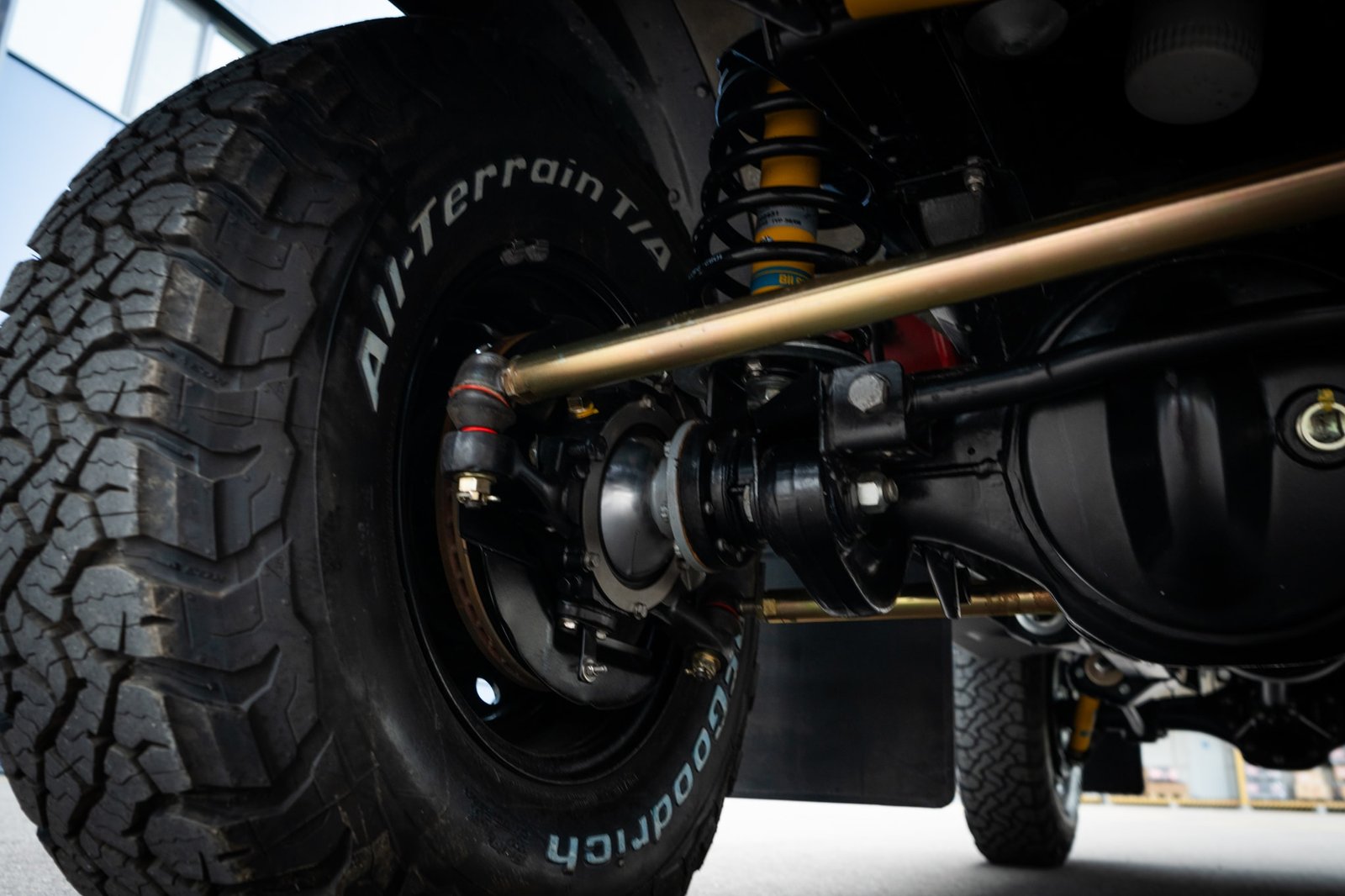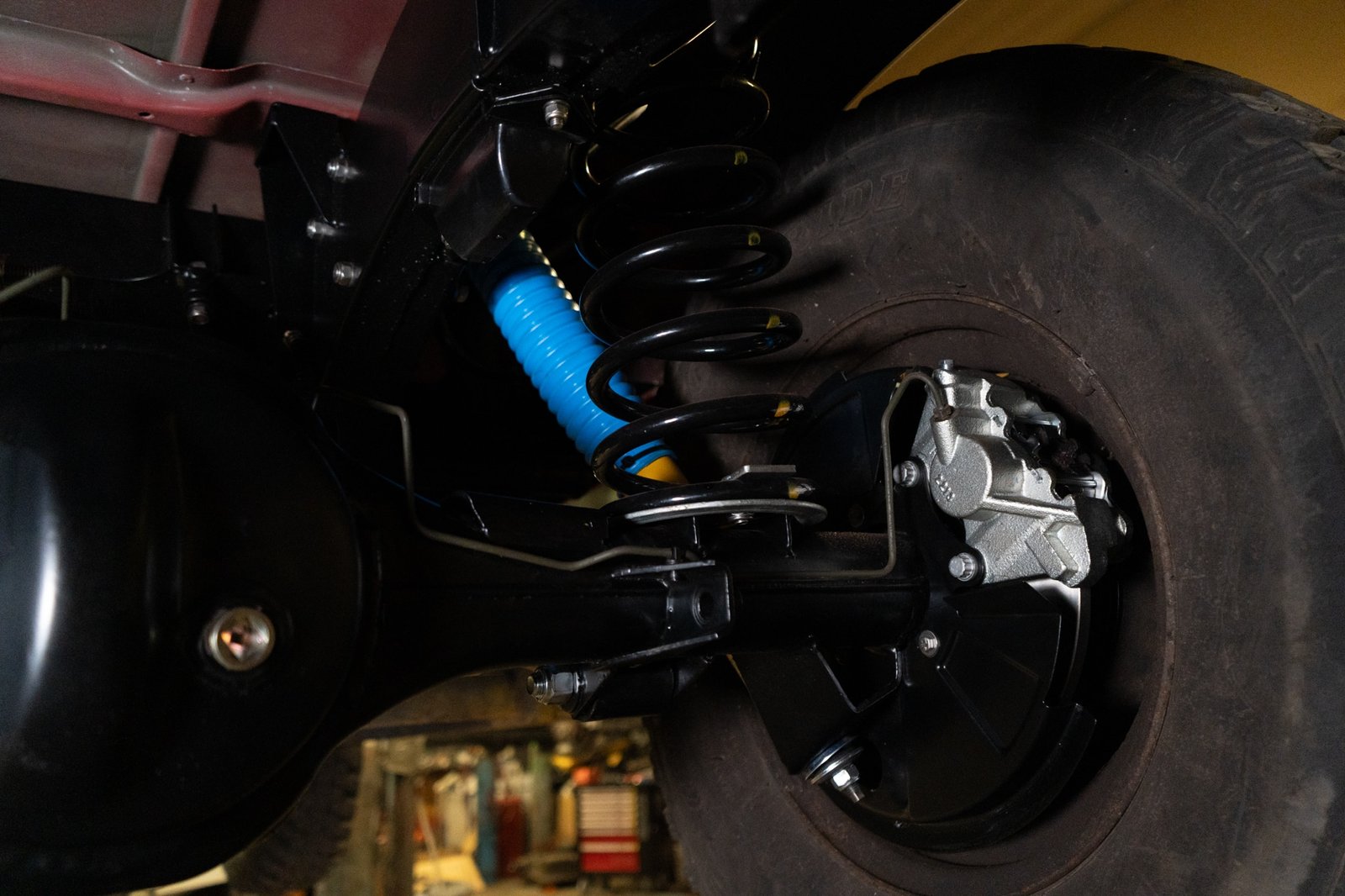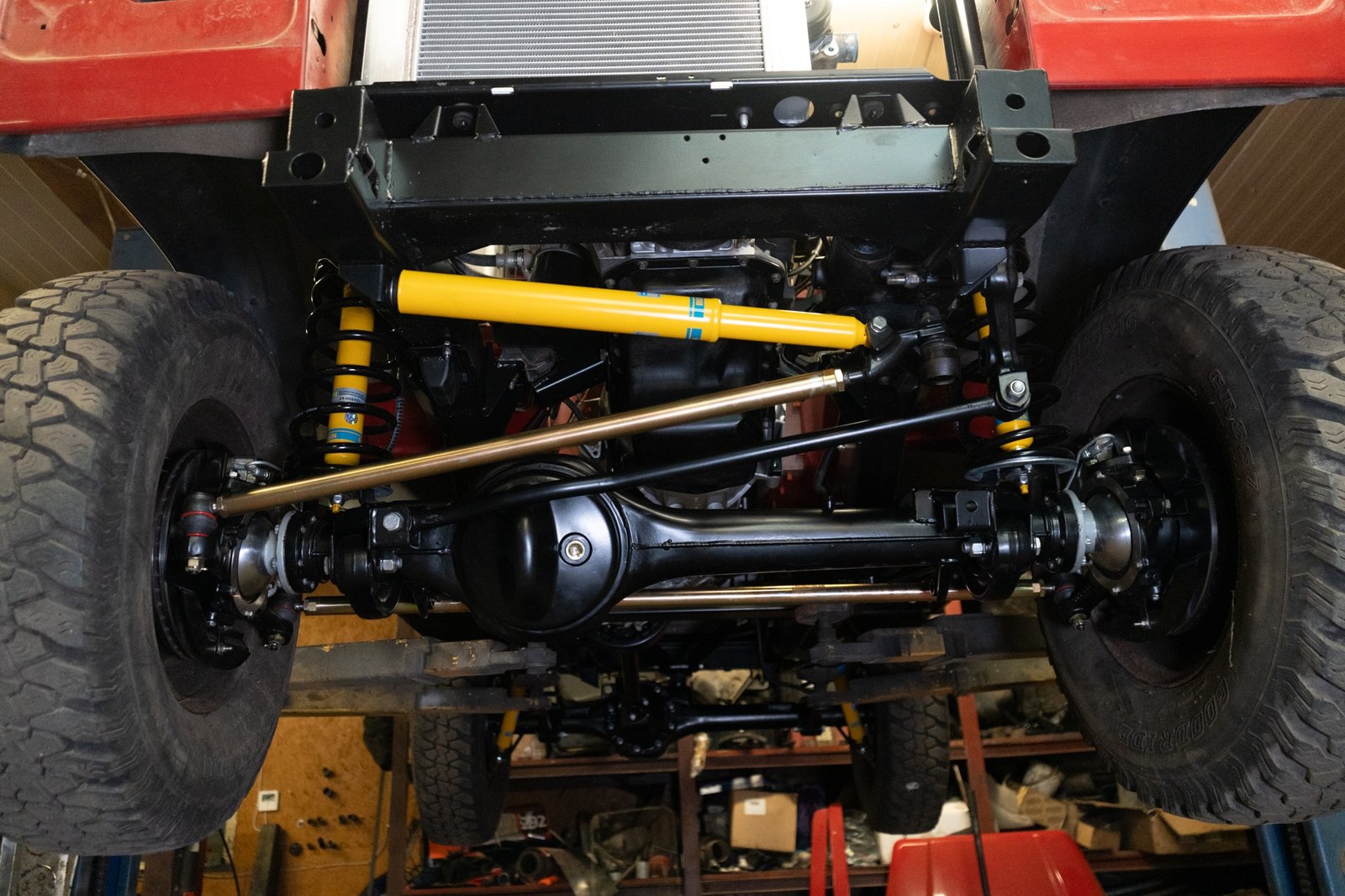 Both axles received the same treatment—sandblasted, powder-coated, and rebuilt. Suspension and steering upgrades include: