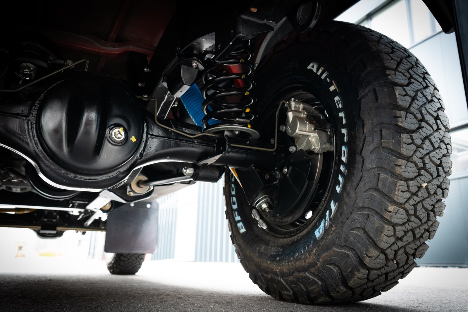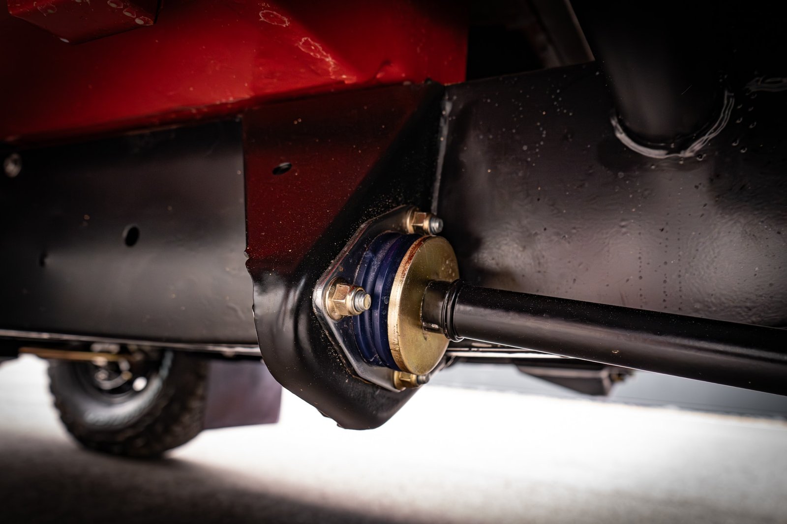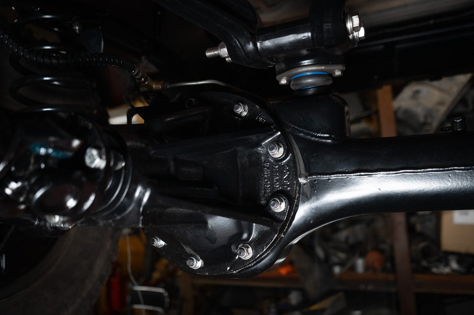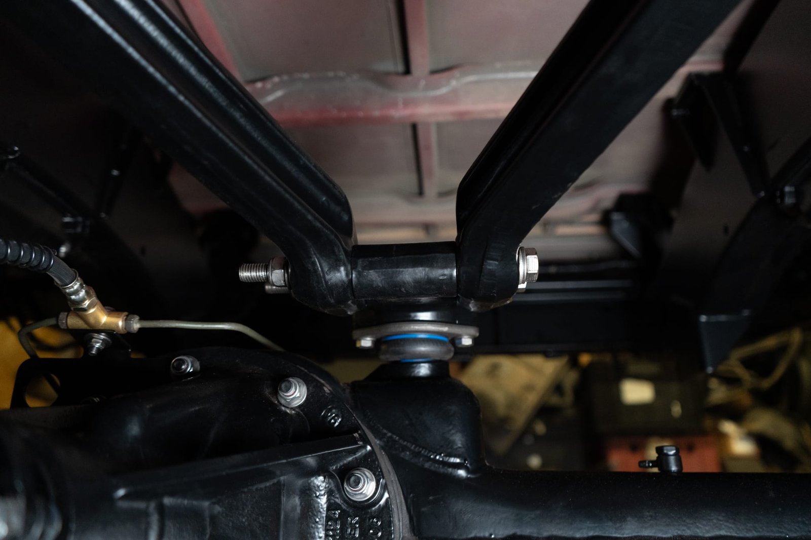 Both axles received the same treatment—sandblasted, powder-coated, and rebuilt. Suspension and steering upgrades include:
