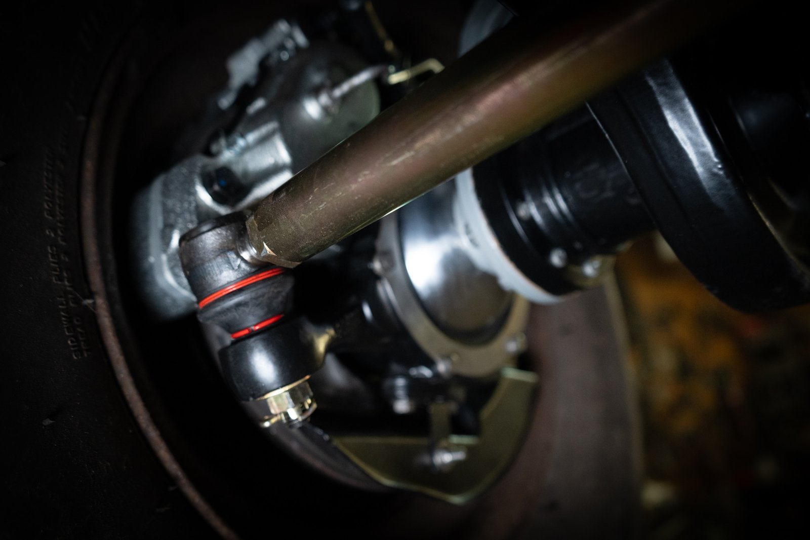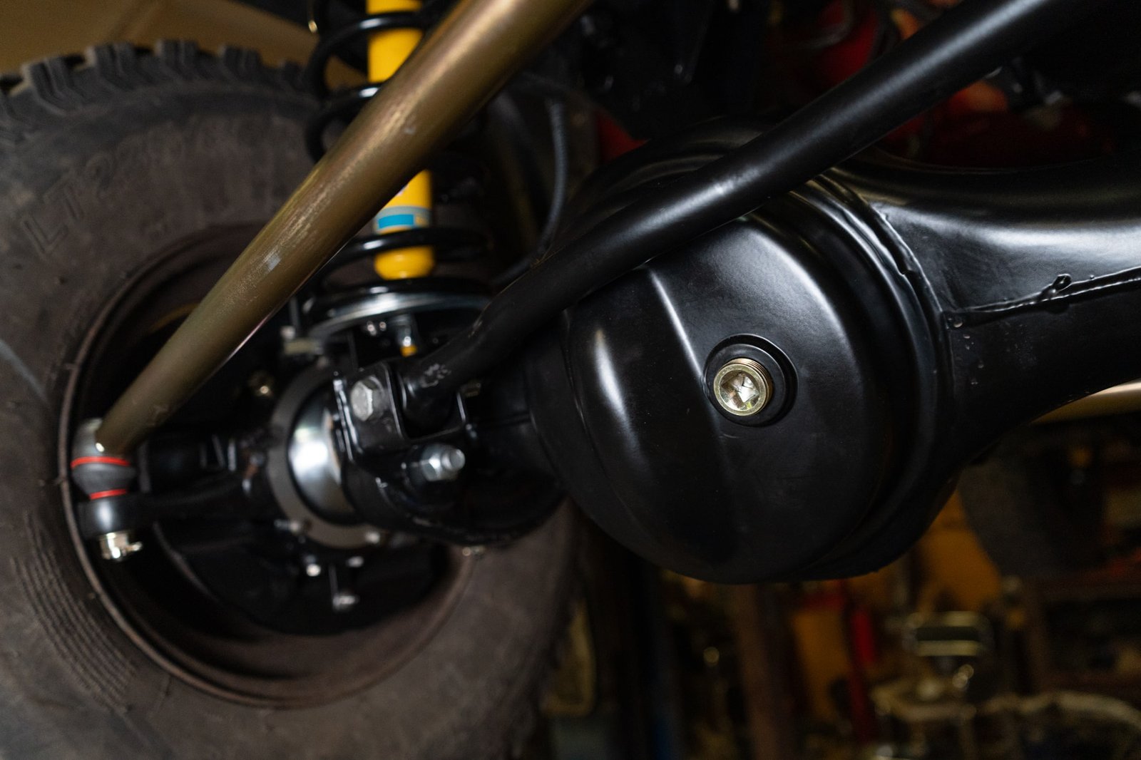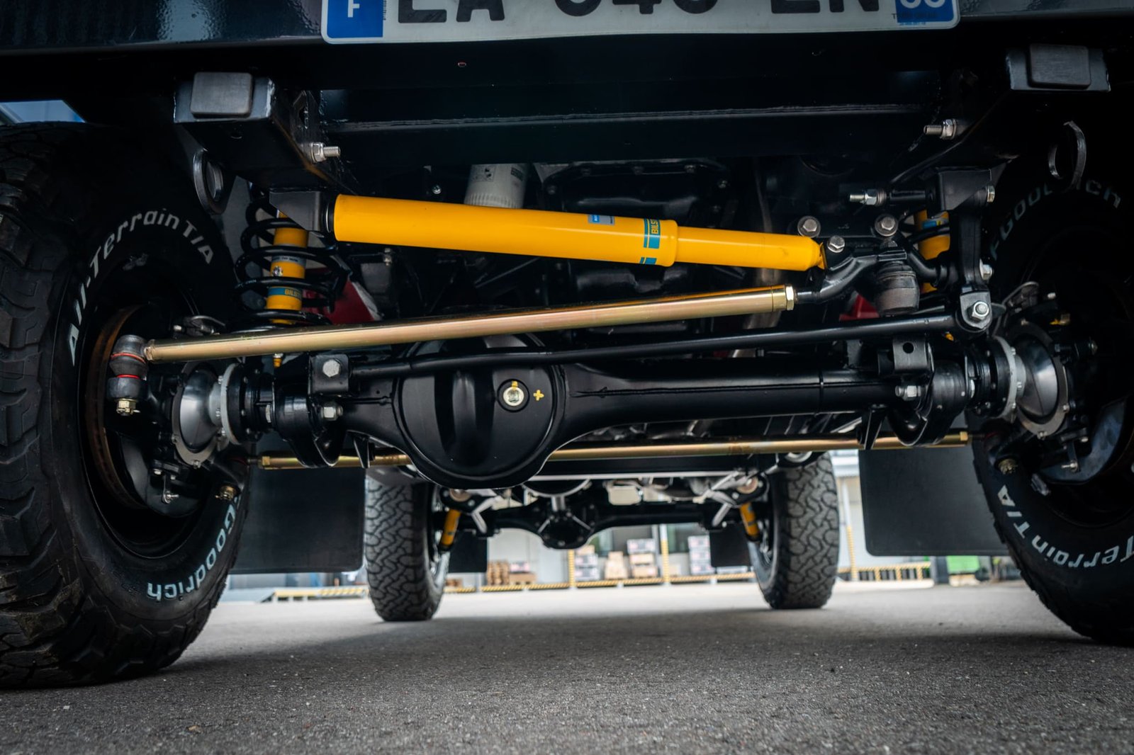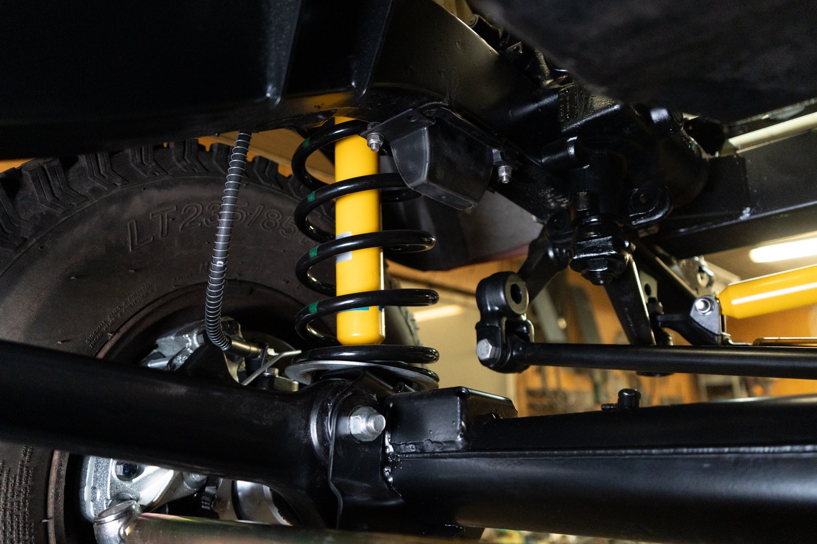 Both axles received the same treatment—sandblasted, powder-coated, and rebuilt. Suspension and steering upgrades include: