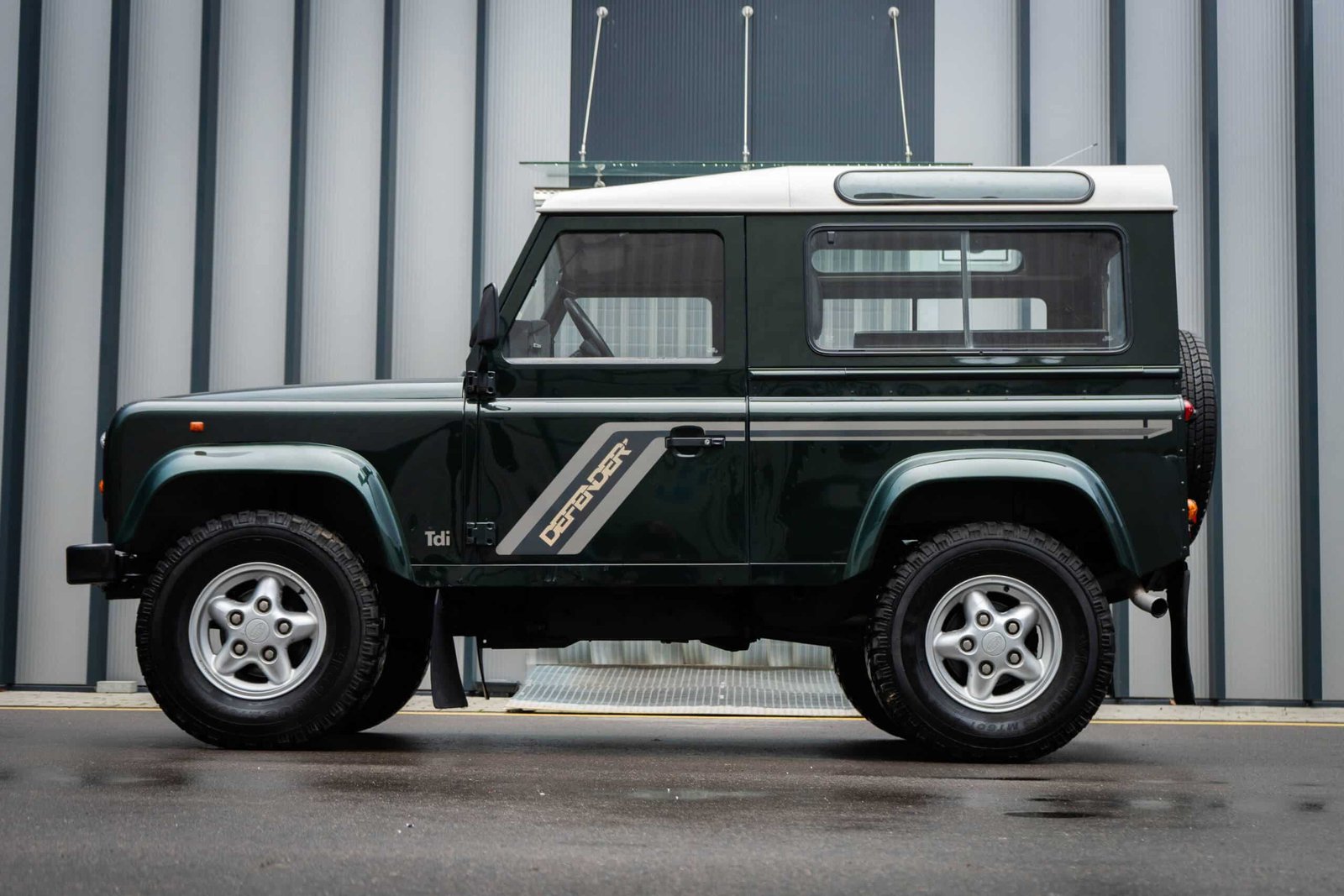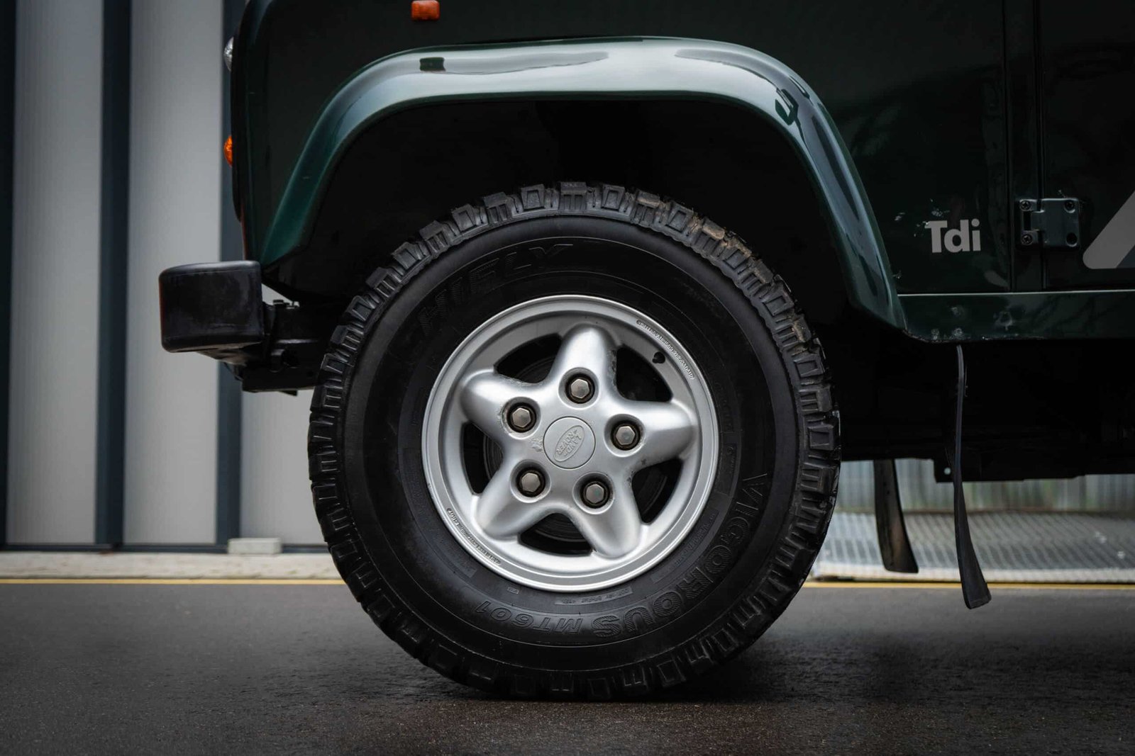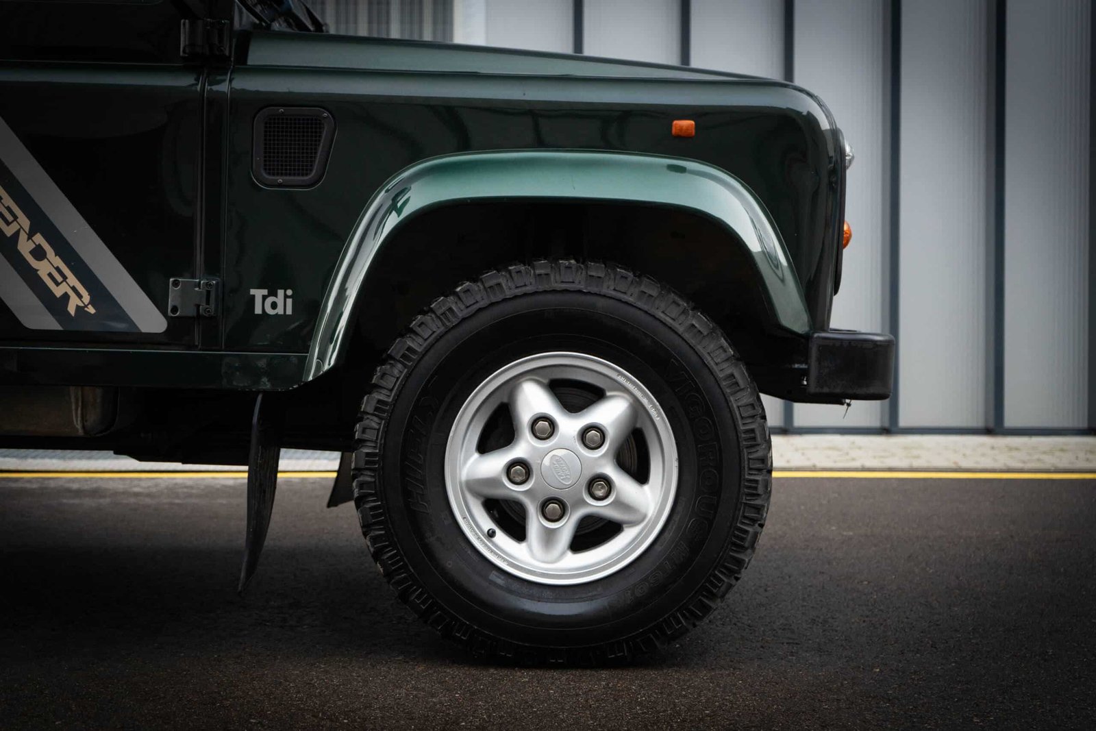 The Defender retains its correct wheels and tyres appropriate for its original specification. (If you’d like to specify tyre brand and condition, I can add that line.)